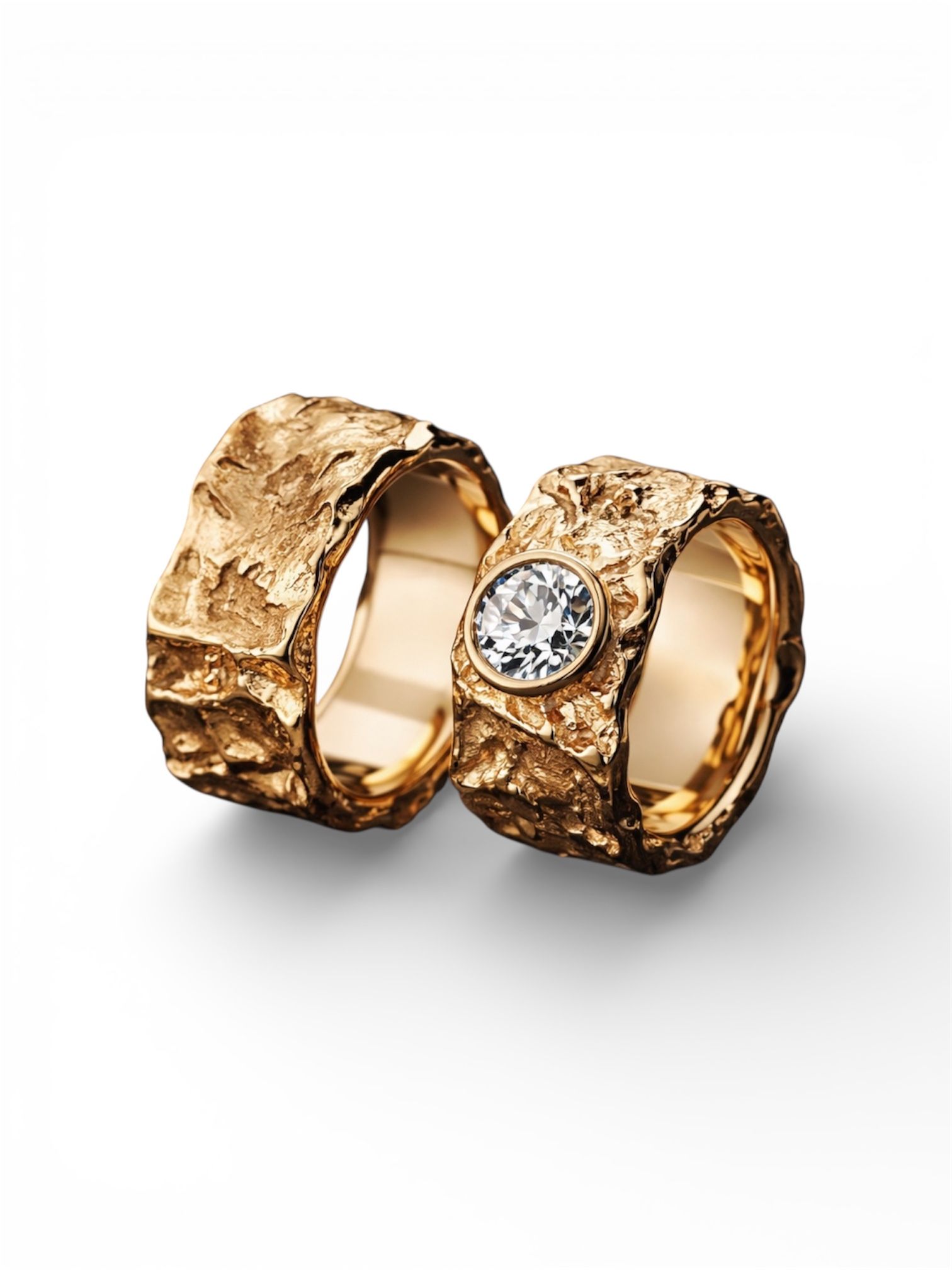 Gelb-Gold Eheringe 750 mit Felsstrucktur - aussen roh, innen poliert.